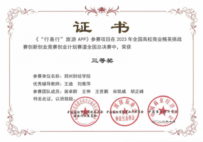 由必赢官网管理学院谢卓群、王伸、王世鹏、宋凯威、胡正峰五名学生组成的“行善行”团队参加此次比赛。在刘雅萍、王迪老师的指导下,五名团队成员团结协作、认真备赛、争分夺秒、苦练内功,与全国高校的1000余支队伍同场竞技。他们凭借扎实的前期积累、娴熟的成果汇报和精彩的线上答辩,经过激烈角逐,最终在2023年全国高校商业精英挑战赛创新创业竞赛创业计划赛道全国总决赛中获得三等奖。