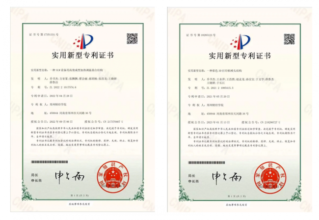 专业学习弄懂以后,她开始突破自我,尝试阅读专业领域的著作与论文,跟随老师参加专利的研发,与老师、同学探讨学术问题。在一次次的探索与磨砺中,王晓妍执着学海的脚步更加坚定。目前,她参与的研发团队成功申请“一种SLM设备用高效成型加热调温基台结构”“一种彩色3D打印机喷头结构”“一种金属3D打印循环供料上料装置”“一种智能加工中心用油水及金属碎屑集中分离装置”“一种柔性面积可调风力发电机用风叶结构”等五项专利,成为专业学习方面的佼佼者。