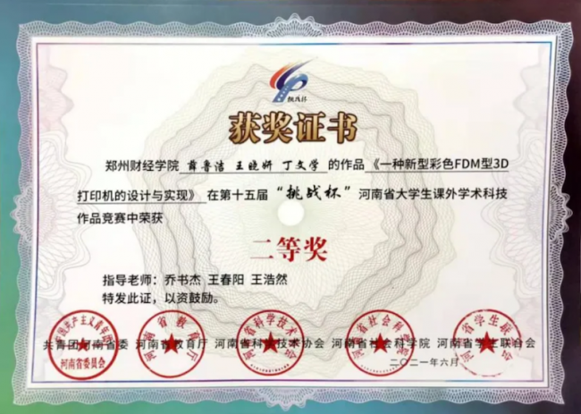 大一时,凭借兴趣她加入了学院的3D打印工作室。经过一学期的训练,寒假她就着手为河南省第十五届“挑战杯”大学生课外学术科技作品竞赛作准备。可是作为科研“小白”,很多东西都不懂,唯一能做的就是逼着自己去阅读大量枯燥艰涩的文献。从最基础的三维制图分析和理论知识学习,再到实践操作,其间她也曾想过放弃,但始终心有不甘,功夫不负有心人,最终,她研究的“一种新型彩色FDM型3D打印机的设计与实现”在学校比赛中脱颖而出,并获得河南省省赛二等奖。