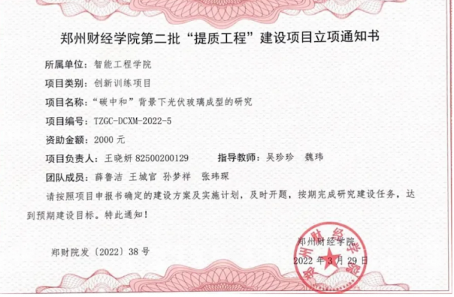 正是参加“挑战杯”这次勇敢的尝试,为她之后的科研实践之路打开了一扇门。她和她的科研团队还参加了2022年河南省“大学生创新创业训练计划”项目,从调研实践,到凝结项目成果,最终,她带领团队完成的“碳中和背景下光伏玻璃成型的研究”成果顺利结项,并在国家级期刊《前沿科学》上得以发表。在学校“十三届互联网+创新创业大赛”中,作为“3D打印为新能源汽车订制绿色心脏”项目核心成员,她与团队成员共同调查搜集资料,进行项目汇报,经过初赛、复赛层层选拔,最终获得铜奖。