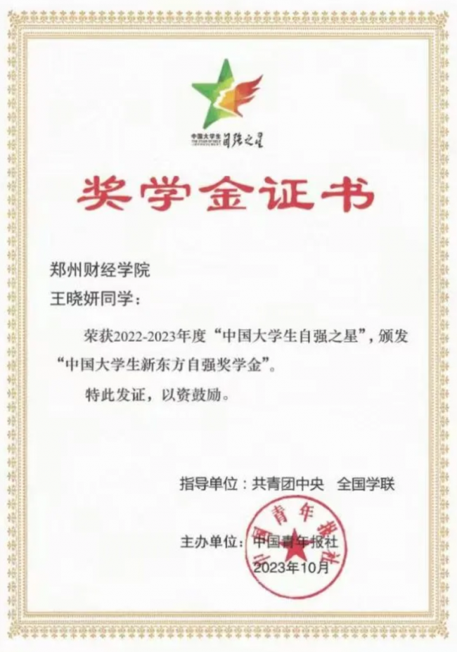 个人简介:王晓妍,中共党员,必赢线路检测中心智能工程学院20车辆本1班学生,班级团支书。大学期间,先后揽获国家级荣誉3项,省市级荣誉6项,校、院级荣誉30余项,包括“国家奖学金”、“国家励志奖学金”、“中国大学生自强之星”奖学金、河南省“优秀学生干部”、河南省第十五届“挑战杯”大学生课外学术科技作品竞赛二等奖等,与老师一起研发申请专利5项,以第一作者身份在国家级期刊《前沿科学》上发表论文1篇。近日,王晓妍同学又荣获第二批全省高校“百名大学生党员标兵”荣誉称号。