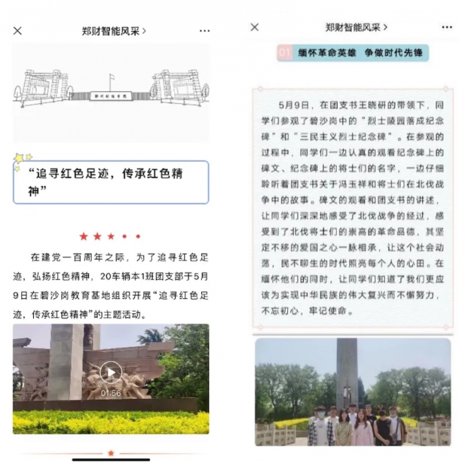 担任班级团支部期间,她带领班级举办班会、集体活动、主题团日活动100余次。为打造支部特色与品牌形象,她带领班级建立“红色团支部”,打造了以“理论导学、寻访研学、竞赛比学”三位一体的红色历史学习教育体系,掀起基层团支部党史学习自主学、创新学、争先学的生动局面。班级先后荣获河南省“文明班级”,校级“五四红旗团支部 ”“先进班集体”“书香团支部”“活力团支部”等荣誉称号。她个人也被评为“河南省优秀学生干部”“郑州市三好学生”、郑州财经学