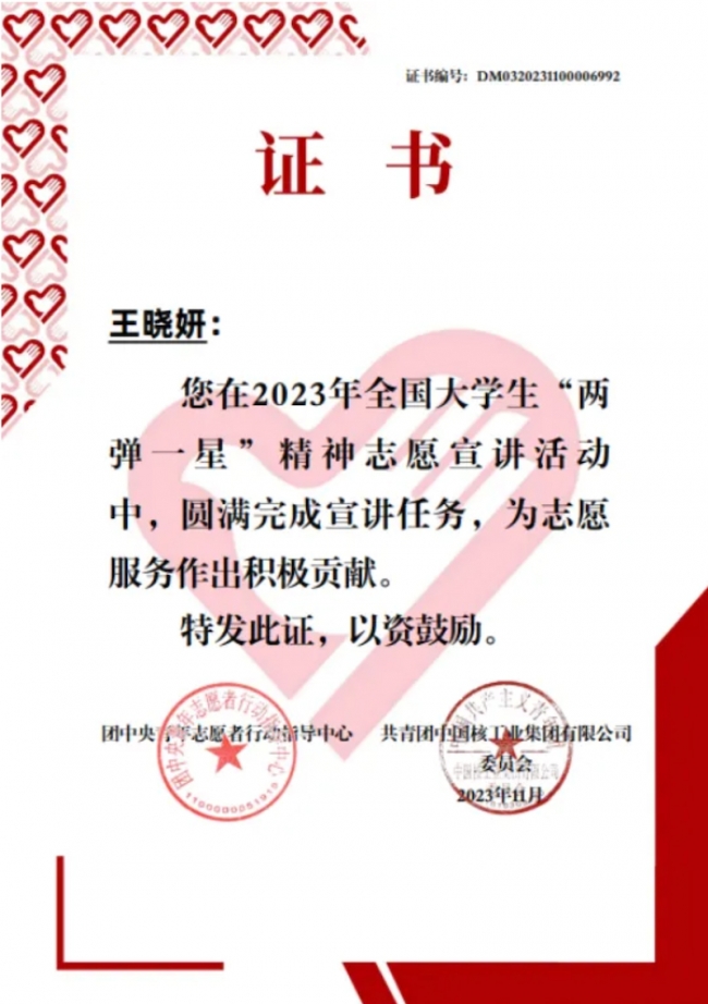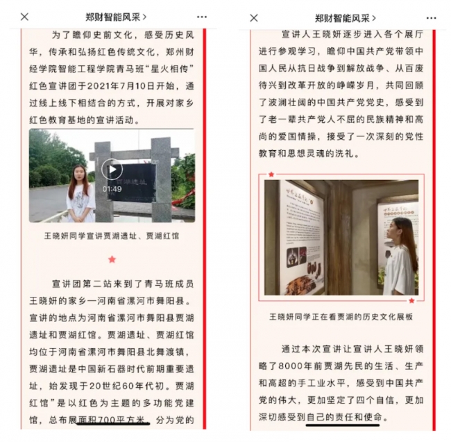 暑期实践中,她先后参加学院青马班“星火相传”红色宣讲团、“‘核’你同行”志愿宣讲团等,深入多地宣讲家乡“贾湖遗址”红色文化与“两弹一星”精神,在增强个人政治理论素质和爱国主义情怀的同时,也带动更多人坚定文化自信与历史自觉。