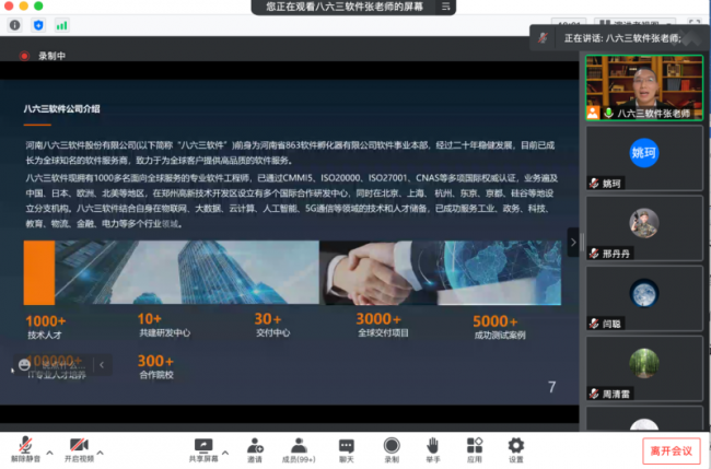 河南八六三软件股份有限公司的张银岗总监和闫聪经理具体介绍了数字经济下IT行业的主流趋势,其中涌现出的新机遇,帮助学生了解目前岗位分工与融合、新的技术特点与大学学科的关系,并通过一些实际岗位招聘信息指导学生毕业后如何选择适合自己的角色、需要掌握的技术知识、如何快速提升工作能力等。